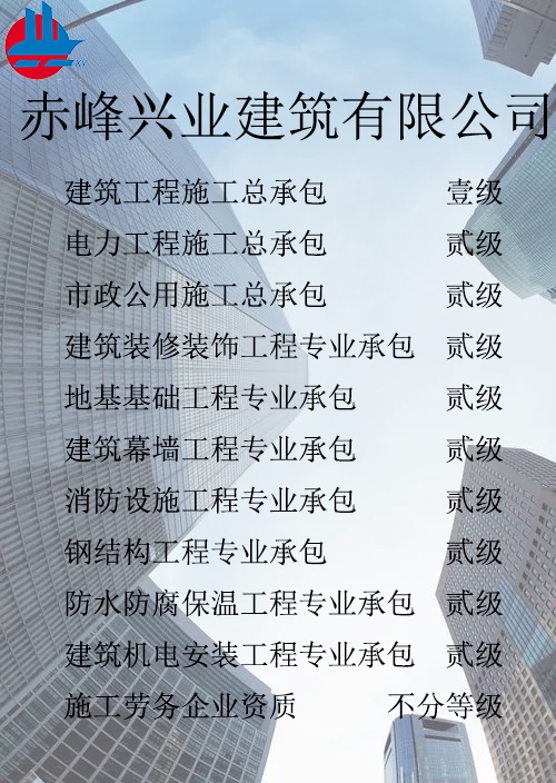 赤峰興業(yè)建筑有限公司簡介 赤峰興業(yè)建筑有限公司成立于1998年7月,位于內(nèi)蒙古赤峰市松山區(qū)。現(xiàn)已發(fā)展成為擁有建筑工程施工總承包壹級、電力工程施工總承包貳級、市政公用工程施工總承包貳級、承裝、修、試四級、?建筑裝修裝飾工程專業(yè)承包貳級、建筑幕墻工程專業(yè)承包貳級、消防設施工程專業(yè)承包貳級、地基基礎工程專業(yè)承包貳級、鋼結構工程專業(yè)承包貳級、建筑機電工程專業(yè)承包二級、防水防腐保溫工程專業(yè)承包貳級以及建筑施工勞務等資質(zhì)的綜合性建筑施工企...